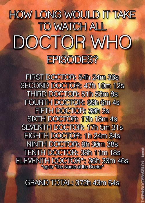 KB SEZ > Film / Television / Media > Total length of all Doctor Who episodes:Film / Television / MediaNewTotal length of all Doctor Who episodes:K.B.November 15, 2014No commentposted on Nov. 15, 2014 at 5:48 pmNovember 23, 2014Total length of all Doctor Who episodes:372 hours 43 minutes 54 seconds *Not including 12th DoctorTags:doctor whodwwhoShare on FacebookShare on TwitterShare on EmailK.B.November 15, 2014previous articleDoctor Who Christmas Special Preview – BBC Children in Need 2014next articleBrrrrr… Frickin BRRRRRRRthe authorK.B.Leave a Reply Cancel replyWrite your comment hereNameEmail ΔYou Might Also LikeFeaturedFilm / Television / MediaNewJames Gunn Responds To Questions About ‘Doom Patrol’ And ‘Titans’ CancellationsJanuary 27, 20231.86KFeaturedFilm / Television / MediaNewBob Iger’s Return, Changes, Reorg And An Impending Earnings ReportJanuary 27, 20231.55KFeaturedFilm / Television / MediaNewEntertainment Industry Unions In Talks To Renew COVID Protocols Due To Expire January 31, 2023January 26, 20232.07KFeaturedFilm / Television / MediaLinks of InterestOnline“Batman v Superman” coming to theaters in 1949January 26, 20233.1KRecommended For YouFeaturedFilm / Television / MediaNewJames Gunn Responds To Questions About ‘Doom Patrol’ And ‘Titans’ CancellationsJanuary 27, 20231.86KFeaturedFilm / Television / MediaNewBob Iger’s Return, Changes, Reorg And An Impending Earnings ReportJanuary 27, 20231.55KFeaturedFilm / Television / MediaNewEntertainment Industry Unions In Talks To Renew COVID Protocols Due To Expire January 31, 2023January 26, 20232.07KFeaturedFilm / Television / MediaLinks of InterestOnline“Batman v Superman” coming to theaters in 1949January 26, 20233.1KFeaturedTechnologyHappy Birthday Alan TuringJune 23, 20222.88KFeaturedFilm / Television / MediaPRISONERS OF THE GHOSTLAND TRAILER – Nicolas Cage’s Most Insane Film? Could be…August 14, 20213.02KFeaturedStuffRelaunching KBSEZ – A Return From The DeadAugust 9, 20212.75KFilm / Television / MediaThe Scarlett Johansson Lawsuit Against Disney Heats Up As CAA Co-Chairman Bryan Lourd Weighs InJuly 30, 20212.72KFilm / Television / MediaScarlett Johansson Files Lawsuit Against Disney Over ‘Black Widow’ ReleaseJuly 29, 20212.72K